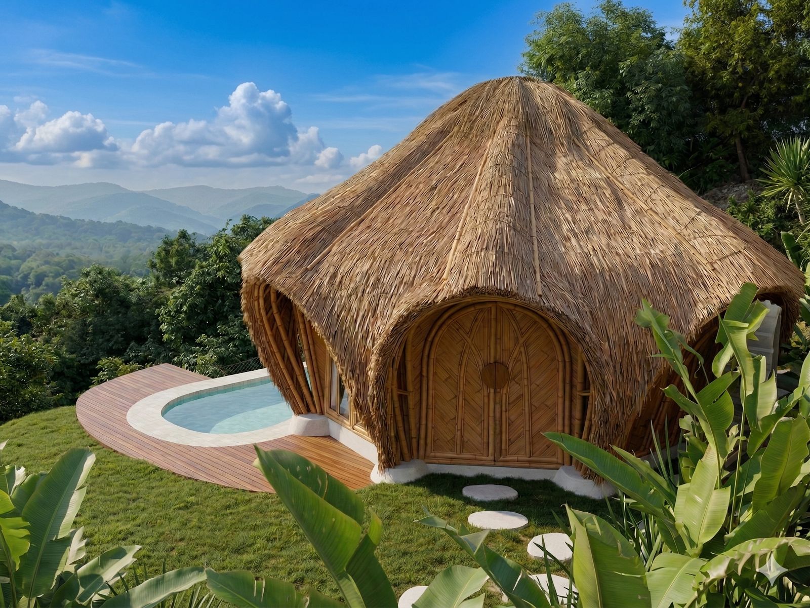 A distinctive tropical retreat that reinterprets vernacular island forms through a sculptural bamboo architecture language. Set within the hills of Kuta, Nanti combines dramatic thatched volumes, curved bamboo detailing, and open-air living with private pools and outdoor bathing elements to create a playful yet immersive escape. The project balances intimacy, texture, and landscape connection, offering a refined expression of barefoot luxury in Lombok.